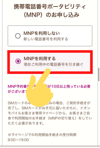 ※他社で使っている番号そのまま乗り換える場合は必ず「MNPを利用する」を選択しましょう。