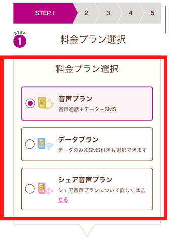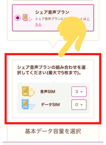 料金プランは「シェア音声プラン」を選択し、少し下にいくと、シェア音声プランの組み合わせを選択することができます。