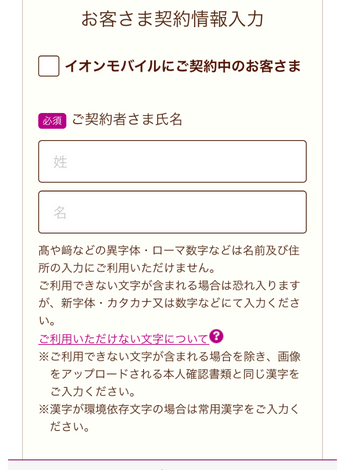 ・右下の画面について、すでにイオンモバイル契約がある方は「イオンモバイルにご契約中のお客さま」を選択してログインをします。それ以外の方はチェックはいれずに氏名等を順番に入力していきます。