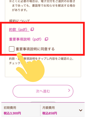 左下の画面は、一個前の手順の続きですが、「約款(pdf)」「重要事項説明(pdf)」を開いて確認しないと同意にチェックがいれられないので注意です。
