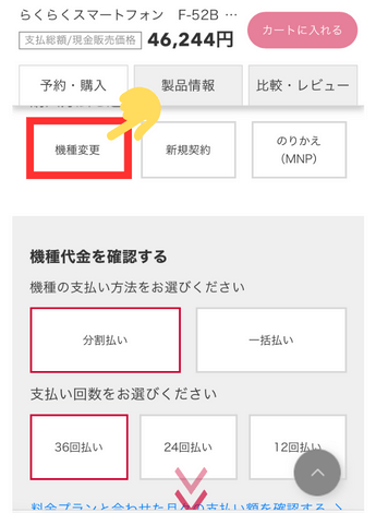 「機種変更」を選択し、支払い方法と回数を選択⇒カートに入れて購入
