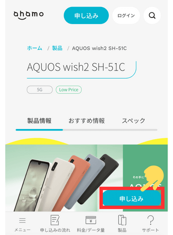 ahamo申し込みと同時にAQUOS wish2を購入する場合は、以下の手順となります。