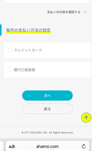 ahamoの毎月の料金支払いには、クレジットカードもしくは銀行口座振替が利用できます。