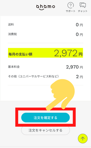 ここまでの申込み内容を確認して間違いがなければ、一番下の「注文を確定する」ボタンをタップしましょう。