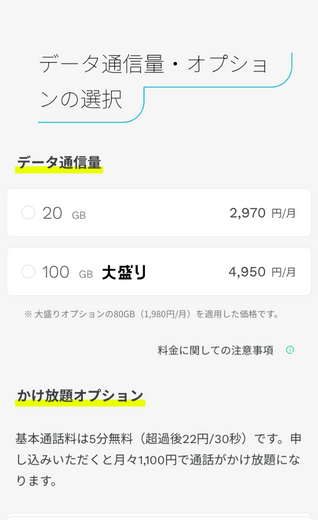 料金プラン(データ通信量)とかけ放題の選択をします。