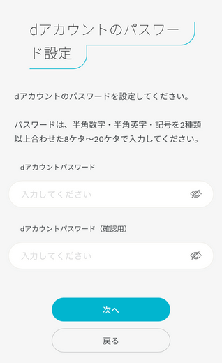メールアドレスを入力したら、次はdアカウントのパスワードを決めます。