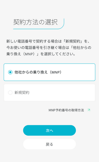 もしうまくいかない場合や、既にMNP予約番号取得済の場合は、従来通りMNP予約番号を使った申し込みも可能です。
