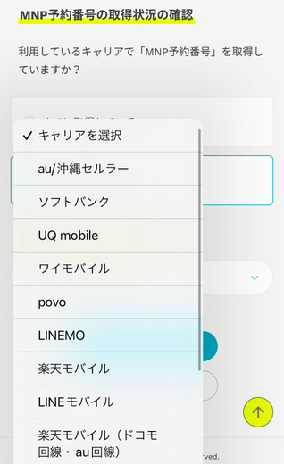 乗り換えする電話番号を入力し、MNP予約番号を取得しているかどうかを選択します。