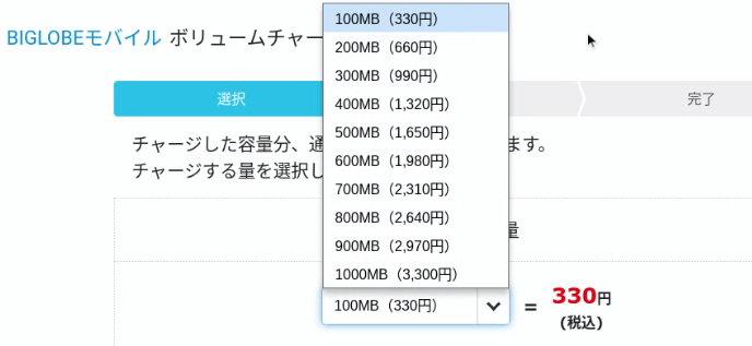 BIGLOBEモバイルの月額プラン料金は1GB (1000MB)1,078円ということを考えると、ボリュームチャージは割高ですね。
