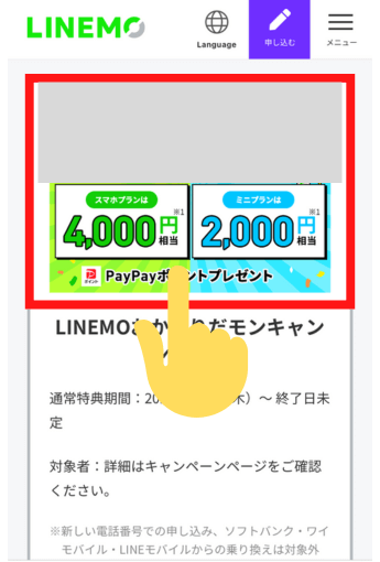 少し下の方へスクロールし、「LINEMOおかえりだモンキャンペーン」のバナーをタップ→「今すぐ申し込む」