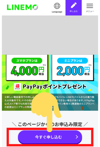 「LINEMOおかえりだモンキャンペーン」を適用するには、専用ページからの申込みが必要です。