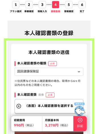 本人確認書類の種類を選択し、スマホのカメラ等でとった本人確認書類の画像を選択します。
