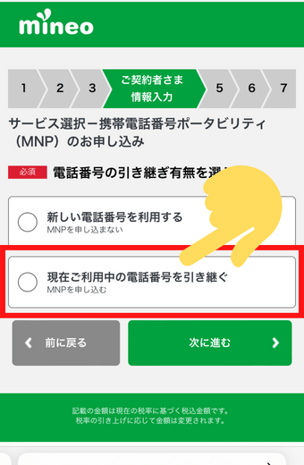 プランなどを一通り選んだら下の画面が出るので、必ず「現在ご利用中の電話番号を引き継ぐ(MNPを申し込む)」を選択しましょう!