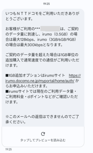 その後、使い切って速度制限がかかったときにもメッセージがきます。