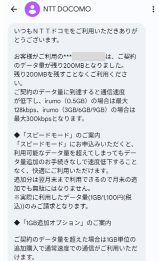 irumoの0.5GBプランでは、残り0.2GBになったときにまずSMSでお知らせのメッセージがくるので安心です💡