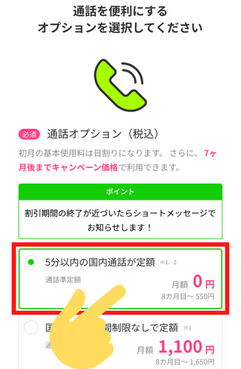 | 5分かけ放題オプション | 月額550円 ※キャンペーンで7ヶ月目まで無料✨ |