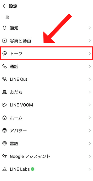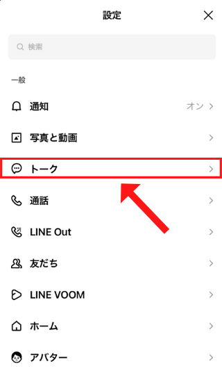 LINEのホーム画面の右上の「設定」を開いて「トーク」をタップ