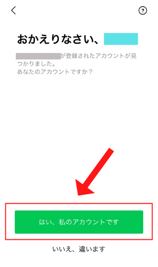「おかえりなさい、◯◯さん」と元々LINEで登録している名前が出てくるので自分のアカウントで間違いないか確認をして「はい、私のアカウントです」をタップ