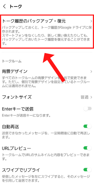 Androidスマホの場合は、「Googleドライブ」という機能使ってトーク内容のバックアップをします。