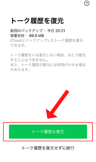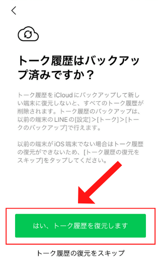 トーク履歴のバックアップをした人はここで「はい、トーク履歴を復元します」をタップ