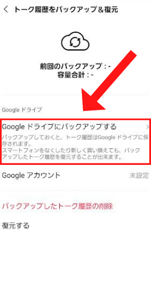 「トーク履歴のバックアップ・復元」を開いて「Googleドライブにバックアップする」をタップ