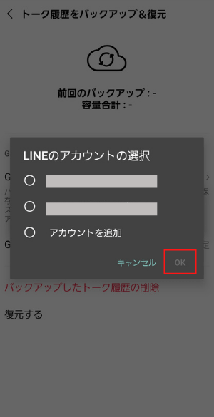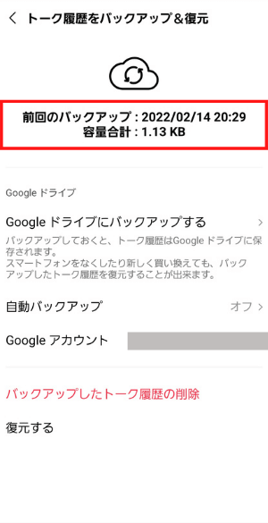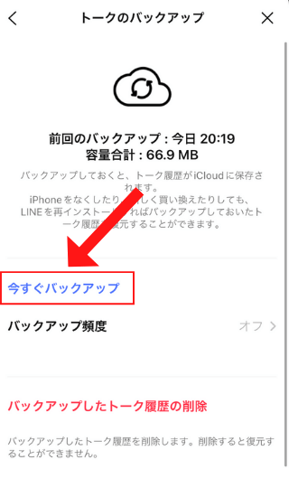 「トークのバックアップ」>「今すぐバックアップ」