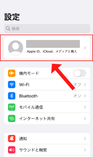iPhoneの「設定」を開き、「Apple ID、iCloud、メディアと購入」をタップ