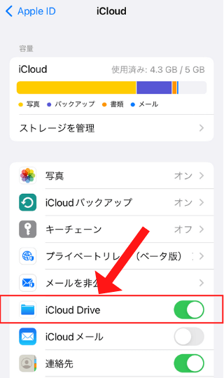 「iCloud」を開き、「iCloud Drive」をオンにする