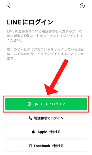 新しいスマホでLINEをインストールし、ログイン>QRコードでログインをタップ