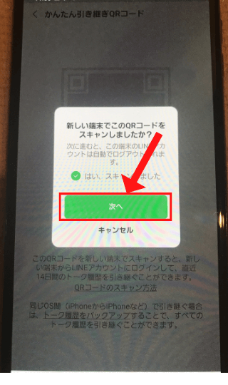 新しいスマホでQRコードを読み取り、元々使っていたスマホで「はい、スキャンをしました」にチェックをいれて次へ