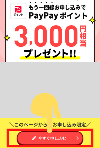 少し下の方へスクロールし、「もう一回線お申し込みでPayPayポイントプレゼント!!(契約者向け!追加申込キャンペーン)」のバナーをタップ→「今すぐ申し込む」