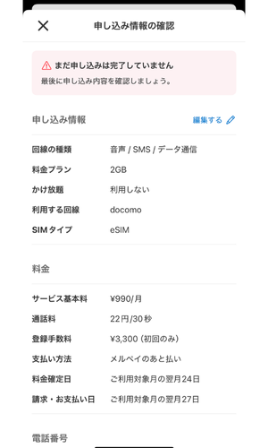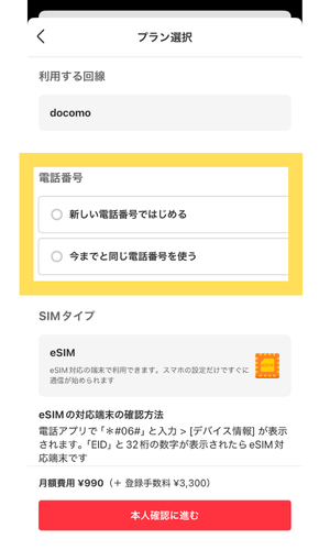 申し込み時にeSIM or SIMカードが選べます。