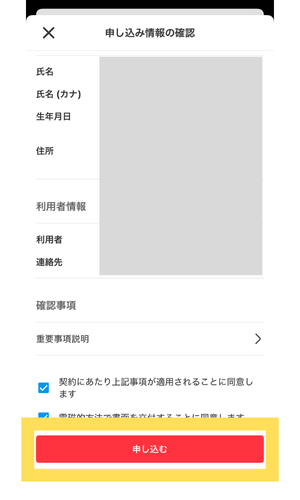 申し込み内容と重要事項説明をし、最後に申し込むボタンをタップします。