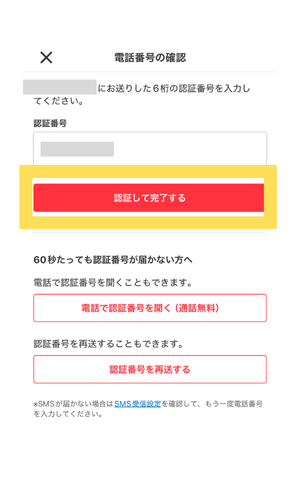 - 電話番号を入力するとSMSが届くので、認証番号を入力します