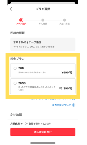 流れに沿って、料金プラン・かけ放題オプションの有無などを選択していきます。