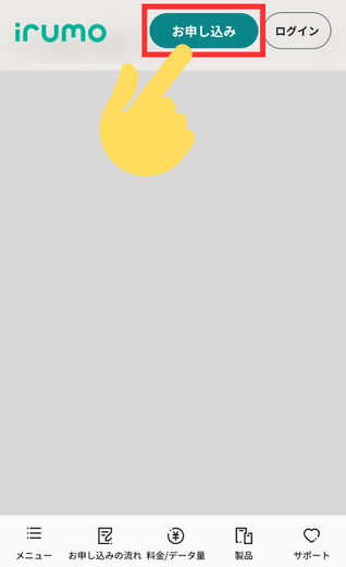 まずはじめに『irumo公式サイト』にアクセスし、上部のお申し込みボタンをタップします。