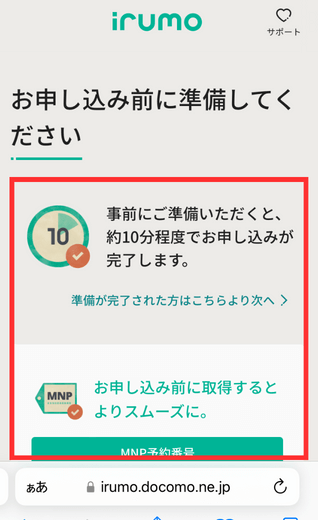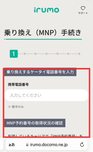 ahamoやeximoからの移行とは異なり、OCNモバイルONEからirumoへの移行時は「MNP(乗り換え)」という形になるため、MNP予約番号が必要です。
