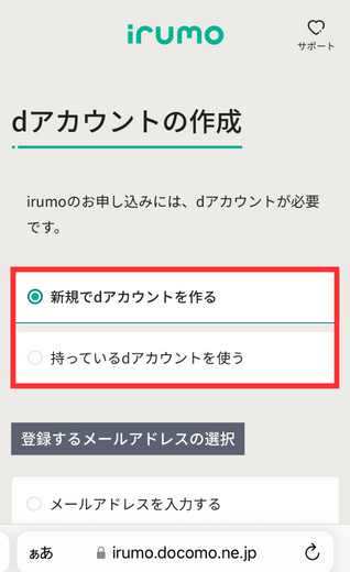 dアカウントを持っていない場合でも、irumoの申し込み手続きの過程で作成が可能なので、事前に作成しておかなくても大丈夫です◎