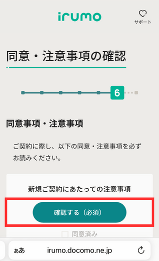 確認するボタンを押して、同意事項と注意事項をチェック・同意します。
