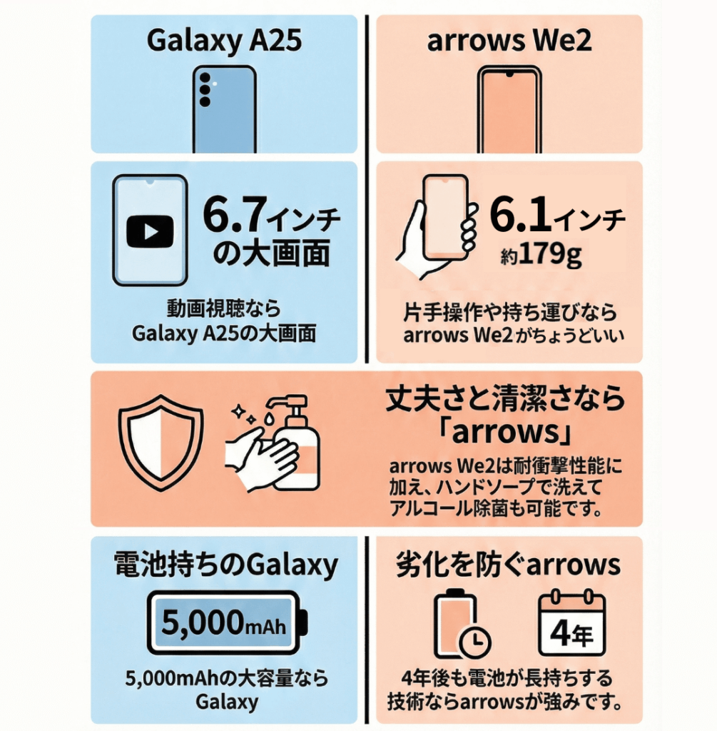 一方arrows Weは、Galaxy A25に比べるとバッテリー容量は少ないですが、電池の劣化を抑える技術によって4年後でも初期容量の80%を維持するという点を売りにしています。