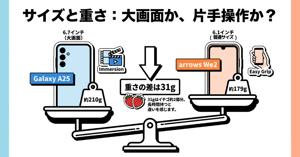 楽天モバイルGalaxy A25とarrows We2のサイズの比較