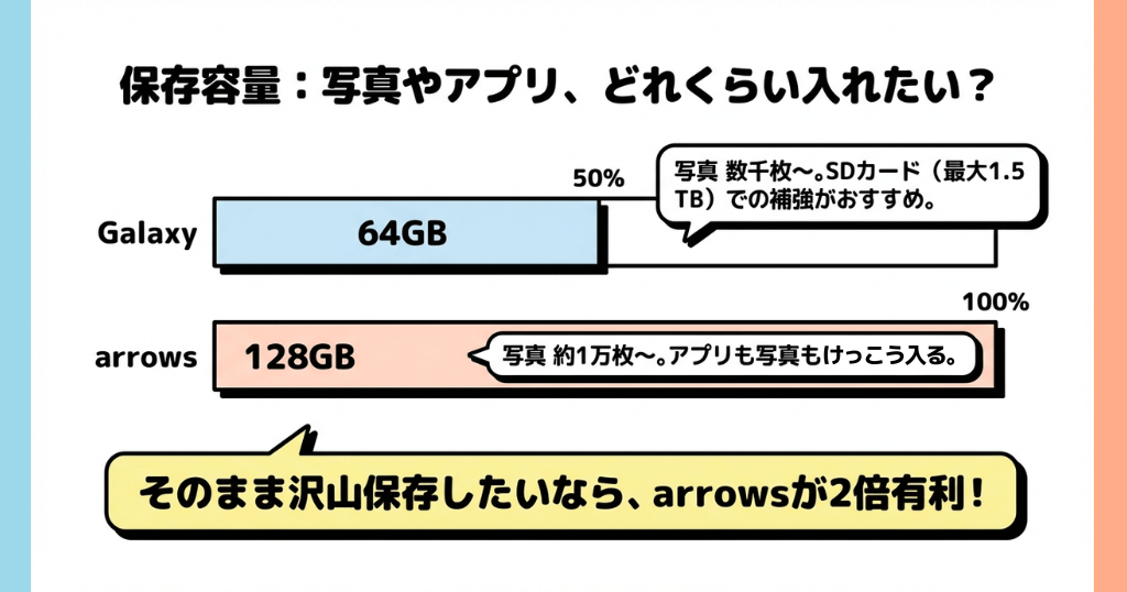 楽天モバイルGalaxy A25とarrows We2の保存容量の比較