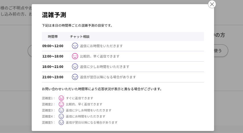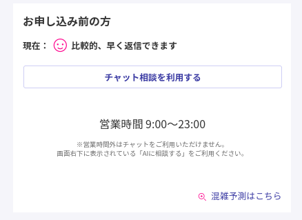 チャットに繋がりやすい時間については、現在の状況と当日の混雑予測が公式ページで確認ができます。