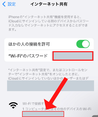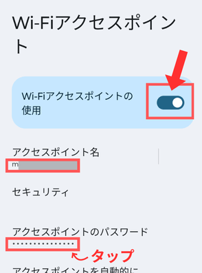 Wi-Fiアクセスポイントの使用をONにして『アクセスポイント名(SSID)』と『パスワード』を確認