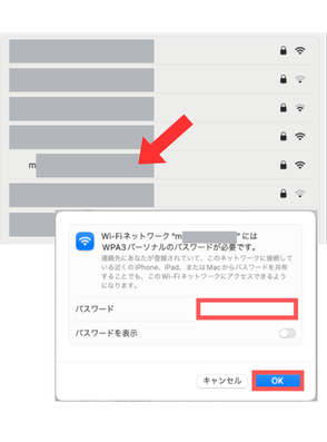 接続したい端末(PCなど)のWi-Fi設定からSTEP2の『アクセスポイント名(SSID)』を探し、パスワードを入力する