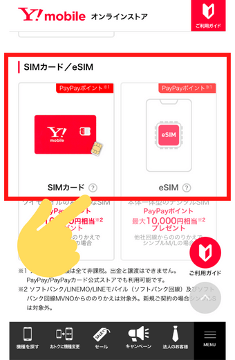 - ワイモバイル公式サイトへアクセスし、SIMカードかeSIMかを選択