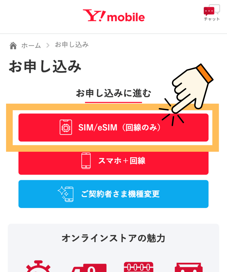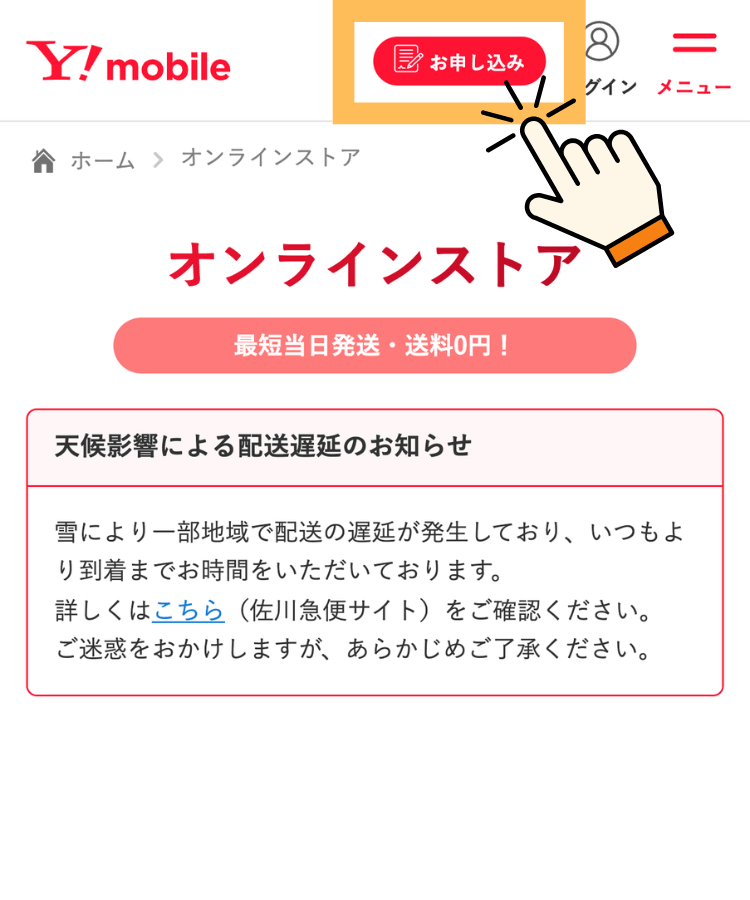- ワイモバイル公式サイトへアクセスし「お申し込み」ボタンをタップ