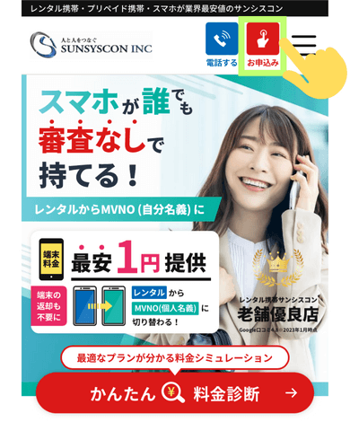 サンシスコン公式サイトにアクセスし、「お申し込み」をタップ