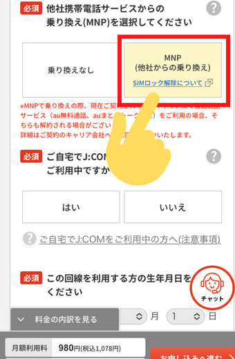 「他社携帯電話サービスからの乗り換え(MNP)を選択してください」という項目では、「MNP(他社からの乗り換え)」を選択しましょう。