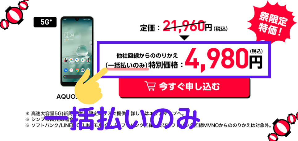 ※キャンペーンでかなりお得になっている機種については、分割払いが選べない場合があります。下記画像のように製品ページに(一括払いのみ)の表記がある場合は一括払いのみです。